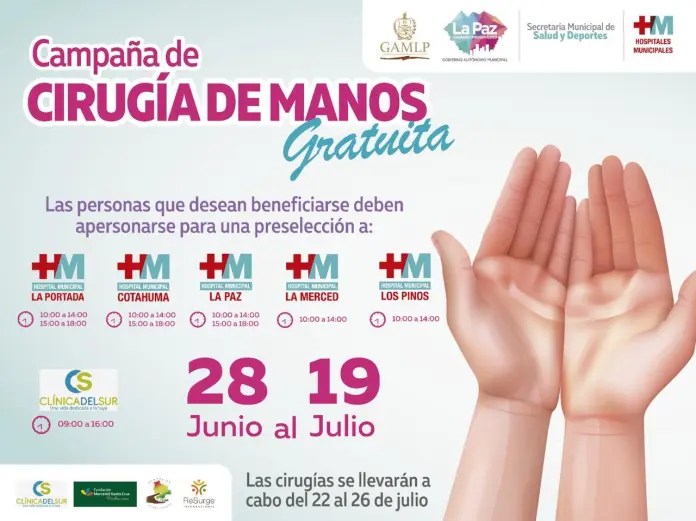 Las evaluaciones y preselección comenzaron el 28 de junio y este proceso se extenderá hasta el 19 de julio, de lunes a viernes. En los hospitales La Merced y Los Pinos se efectúan de 10:00 a 14:00; mientras que en La Portada, Cotahuma y La Paz, de 10:00 a 14:00 y de 15:00 a 18:00. En tanto, las cirugías se realizarán en el Hospital del Sur del 22 al 26 de este mes.